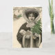 O texto do dentro diz: "Desejo-te o mais feliz dos feriados." Edite esta mensagem enquanto vê o ajustado. Imagem de um cartão postal francês de Natal, feito com uma dama carregada de árvores e um trenó desenhado.