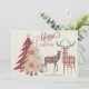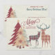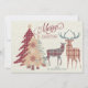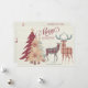 Este cartão de Natal rústico tem três árvores de Natal padronizadas em xadrezes, bolinhas e padrões de flocos de neve em tons mudados de burgundy, bronzeado e estrelas de ouro verde no topo de duas árvores. Há também dois veados xadrezes em pé em um esquema de cores correspondente. O dinheiro tem galhadas de cinza azul empoeiradas. Há rico de cartaz que diz "Feliz Natal" ao lado das árvores O lado da frente também é personalizado com seu nome de família ou outro texto em cartaz azul. Os mesmos elementos são transferidos para o lado traseiro e várias caixas de texto foram adicionadas para permitir que você personalize a placa como quiser.