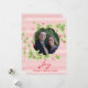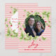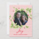 Na moda, cartão de saudação de Natal plano, feito em um padrão de riscas horizontais pálidas, vermelhas e brancas, com um recorte redondo para sua fotografia. Gráficos de bonito vinhas verdes claras com bagas vermelhas, decorados em volta da área de fotografia. Personalize o texto vermelho, na parte inferior do cartão, e adicione sua própria fotografia. Os produtos correspondentes estão disponíveis.
