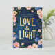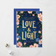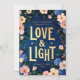 Envie as bençãos de Hanukkah com elegância e encanto usando este cartão floral de feriado "Amor e Luz". Colocada sobre um fundo azul rico em marinho, a inscrição no ouro é enquadrada por um arranjo exuberante de flores aquáticas em pintas e azuis macios. Uma bela mistura de calor sazonal e detalhes artísticos, esta carta é perfeita para celebrar Chanucá com amigos e familiares. Personalize com seu nome e ano para uma saudação verdadeiramente especial.