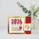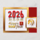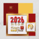 Grande quadrado emoldurado em cores douradas com grande vermelho 2026 + saudação em chinês e inglês + pequeno ideograma chinês para Cavalo e uma pequena mesma sequência moldada em cores de ouro para um desenho original de ouro. Design no cartão postal de férias com textos personalizados na parte traseira do cartão. Você pode facilmente alterar textos clicando no botão personalizar. Perfeito para o Ano Novo Chinês do Cavalo 2026.