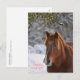 Um cavalo parado na neve debaixo da maleta. Šťastný nový rok - Feliz ano novo!
