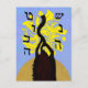 Arte de Rosh Hashanah. Figura escura silhuetada levanta um shofar contra uma paisagem desértica e um grande sol giratório. Com as palavras "shanah tovah" em hebraico.