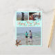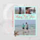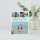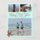 Cartão postal de Ano Novo feliz com tema de praia. Cor azul tropical com texto laranja e um local para imprimir um endereço de envio. Envie três fotos, com duas imagens menores no topo e uma foto maior na parte inferior. Uma estrela-do-mar marrom decora o canto e a data do novo ano está em números grandes atrás da saudação. Se a temporada de férias passou despercebida, envie um cartão para o ano novo.