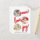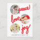 Personalize este cartão de Natal de colagem de 3 fotos vertical moderno e simples, projetado com texto manuscrito em vermelho negrito: paz, amor, alegria em branco. As fotos têm formato circular. Substitua todas as imagens do modelo pelas suas e altere todas as informações. Para melhores resultados, use imagens de alta resolução. O mais fácil é usar imagens quadradas. Para outros formatos, pode ser necessário personalizar as fotos. Você faz isso clicando no botão 'Personalizar'. Você poderá redimensionar e mover as fotos. Fotografia © Storytree Studios, Stanford, CA