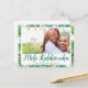 Folhas verdes tropicais bordam sua foto. Abaixo da sua imagem está o texto desejando aos seus amigos e familiares Mele Kalikimaka, em havaiano "Feliz Natal". O nome da sua família é impresso abaixo da saudação de Natal. O texto é impresso com duas fontes coordenadas em verde de Natal. Uma simples saudação de Natal é impressa no verso do cartão postal junto com seus nomes. O texto é impresso com uma fonte verde de Natal. Para enfeitar o cartão postal acima da linha de endereço está um texto com letra cursiva direcionando ao Sr. Carteiro Por favor Entregue para: com espaço abaixo para o endereço manuscrito.