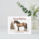 Celebre a temporada em um estilo equestre atemporal com este cartão de Natal do cavalo Paso Fino, apresentando um cavalo Paso Fino lindamente detalhado ao lado de uma árvore suavemente iluminada. Os tons vintage e texturas naturais evocam um charme clássico do campo. Personalize o nome da família para um toque pessoal que é perfeito para entusiastas de cavalos e estética rústica de Natal. Personalize seu endereço e saudação no verso do cartão.