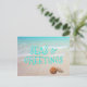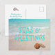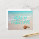 Cartão postal de férias mar e saudações com cena de praia e conchas. Toda a redação, frente e verso, é fácil de mudar ao seu gosto. O texto sombreado em azul aqua brilhante é impresso sobre a água tropical do oceano. Envie saudações acessíveis de um clima quente.