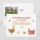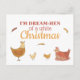 O presente perfeito para seus amigos amantes de frango, este bobo cartão postal de natal é super fofo e certamente faz alguém rir. Pun lê: "Eu sou Dream-HEN de um Natal branco" e apresenta lindas galinhas e pintinhos ilustrados. Personalize as costas com seus próprios nomes familiares e saudando um cartão que não esquecerão logo! Um cartões de natal divertido e não tradicional para qualquer um que goste de uma boa piada!