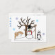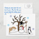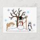 Este cartão-postal tem Huskies Siberianos brincando na neve com um boneco de neve e caindo flocos de neve.