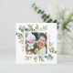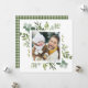Este Natal de texto personalizado | cartaz fotográfico quadrado de férias pintado com aquarela eucalipto, folhas verdes e impressão de xadrez de inverno verde no verso. Mande alegria de férias para sua família e amigos.