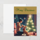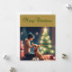 Este cartão de Natal encantador mostra uma foto de Chihuahua vestindo um chapéu de Papai Noel e sentado em frente a uma árvore de Natal com um menino. Os grandes olhos castanhos e a expressão feliz do cão certamente põem um sorriso na face de qualquer um que o receba.