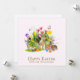 Este cartão de férias plano apresenta um dos meus desenhos de colagem de coelhos da Páscoa no jardim de flores com ovos de Páscoa coloridos. Personalize este cartão da Páscoa com sua mensagem de Páscoa e nome.