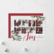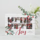 Cartão com fotos elegante e russo apresenta oito fotos quadradas favoritas em um layout de colagem, em uma fazenda inspirada em uma prancha branca de aparência. Duas ranhuras de folhas verdes de aquarelas e de groselhas brancas estão sobrepostas nas esquinas, com "Joy" em caracteres festivos vermelhos esboçados com a mão. Personalize com seus nomes no canto inferior direito.