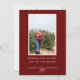 Coroa de pinheiro de floresta de inverno em aquarela, "Felizes Festas", cartão de foto de Natal plano sobre fundo creme antigo. A parte de trás do cartão apresenta uma segunda foto emoldurada sobre fundo vermelho profundo com linhas de modelo para o seu texto personalizado.