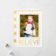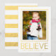 Folha de ouro impressa acredita no Cartão com fotos de feriado contemporâneo. Elke Clarke © Disponível em www.zazzle.com/monogramgallery. Envie suas cartões de natal de Natal para seus amigos e família usando este belo e clássico cartão com fotos de feriado com a palavra "Acredite" em texto de tipografia dourado, design de fotograma fotográfica em formato de cartão vertical. Substitua a foto de exemplo por sua. Foto impressa de folha de ouro e fundo listrado branco na parte traseira do cartão. Outras cores disponíveis para o padrão alinhado e a cor da palavra acreditam em nossa loja.