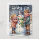 Traga alegria de férias com este maravilhoso cartão de Natal, com duas crianças felizes construindo um bonitão de neve num dia de inverno nevado. Perfeito por compartilhar saudações da época com entes queridos, este cartão festivo captura o calor e a alegria das férias numa encantadora cena de inverno.