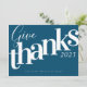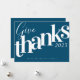 Envie cartões de natal a clientes comerciais e clientes comerciais com este cartão de feriado comercial tipográfico moderno. Ele apresenta uma saudação ousada e tipográfica de "dar obrigados". Personalize esta placa simples com seu nome de negócios, mensagem e ano personalizados. Adicione uma mensagem e um logotipo personalizados (claro ou branco) à parte traseira da placa. Escolha entre uma grande variedade de tipos de papel. Selecione a placa retangular em forma de 5" x 7" ou adicione uma forma de borda recortada. Itens correspondentes estão disponíveis.