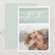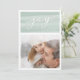 Compartilhe cartões de natal com esses Cartões de foto de Natal chic com sua foto favorita, tocada por "alegria" em um script branco, escrito à mão, em um fundo verde-claro de lavagem a aquarela. Personalize com sua saudação personalizada e seu nome ou nomes de família.