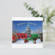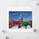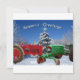Uma cena de Natal nevada com dois tratores antigos. Um trator é vermelho e o outro é verde. Ambos os tratores estão decorados com luzes e estacionados em frente a uma árvore decorada com uma estrela no topo. Texto do cartão Saudações de Fim de Ano e o verso do cartão plano Haja paz na terra e boa vontade para com os homens. Você pode alterar o texto neste cartão.