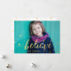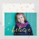 Cartão com fotos de Feriado de Ouro Impresso - Horizontal. Elke Clarke© Envie seus cartões de natal de Natal para seus amigos e família usando este belo e simples cartão com fotos de feriado com a palavra "Acredite" em texto de escrita manual em ouro sobre design. O padrão Bonito de estrela de ouro confetti rodeia o texto e faz um padrão elegante divertido na parte de trás da placa. Substitua a foto de amostra pela sua. Efeito fotográfico impresso de folha de ouro. Outras cores e estilos estão disponíveis em nosso compro em www.zazzle.com/monogramgallery.