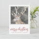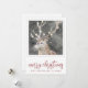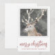 Uma serena e alce na neve de inverno com luzes brilhantes em galhadas, com um pinho e borda de tosse de folha. O moderno script de pinks de rosa é feliz no Natal.