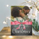 Cartão com fotos festivo apresenta suas imagens favoritas adornadas com uma ilustração de arco de fita vermelha e grampos de pinheiro verde. "Feliz Natal" aparece debaixo de letras brancas sobre um fundo de chalkboard rústico. Personalize com seus nomes e o ano.