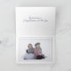 Cartão de Natal elegante com foto feito em branco, na frente com três ornamentos azuis regência leve, com brilho falso. A parte inferior interna tem um espaço para personalizar com sua fotografia e a parte superior tem texto de saudação personalizado que você pode personalizar para ler o que quiser.