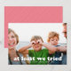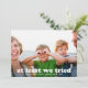 Este cartão com fotos engraçado apresenta uma foto horizontal com sangramento de cheio com a saudação "pelo menos tentamos". Este design acomoda uma foto horizontal. A COR de saudação é TOTALMENTE EDITÁVEL - basta clicar em "Clique para personalizar mais" no menu suspenso de personalização! Você pode personalizar esse design ainda mais, alterando a cor do plano de fundo tanto na frente quanto no verso, além de adicionar outra foto ou texto adicional ao backer. Esta carta hilária é perfeita para uma família com crianças bobos ou quando a foto da família planejada não se torna muito correta!