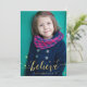 Folha de ouro impressa Acredite no Cartão com fotos de feriado. Elke Clarke© Envie suas cartões de natal de Natal para seus amigos e família usando este cartão com fotos de Natal bonito, simples e contemporâneo com a palavra "Acredite" em escrita manual clássica, dourada, texto sobre texto, design num formato de cartão vertical. O padrão bonito de estrela dourada confetti rodeia o texto e faz um padrão elegante divertido na parte de trás do cartão. Substitua a foto de exemplo por sua. Efeito fotográfico impresso de folha de ouro. Outras cores e estilos estão disponíveis em nosso compro em www.zazzle.com/monogramgallery.