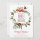 Cartão de Natal inspirador com uma adorável coroa aquática, coroa floral, com elegantes poinsetos vermelhos, eucalipto verde, bagas vermelhas e um pássaro. Dentro a coroa tem a mensagem "Que o espírito do Cristo te abençoe este Natal." Na parte inferior está o verso bíblia Luke 2:10 e o anjo disse a eles, Medo não: por exemplo, eis, eu trago boas notícias de alegria excelente, que será para todas as pessoas. A parte traseira desta placa é vermelha sólida.