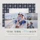 Um cartão de feriado náutico bonito apresenta três das suas fotos favoritas em um layout de colagem, com a inscrição "é o SEAson" em azul marinho e aqua em uma faixa de marfim quente de praia. Adicione uma fotografia e uma mensagem adicionais ao fundo, sobre um padrão de fundo de âncoras e rodas do navio em marinho e branco.