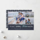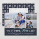 Um cartão de feriado náutico bonito apresenta três das suas fotos favoritas num esquema de colagem, com a inscrição "é o SEAson" em branco e aqua numa faixa azul marinho. Adicione uma fotografia e uma mensagem adicionais ao fundo, sobre um padrão de fundo de âncoras e rodas do navio em marinho e branco.