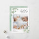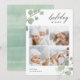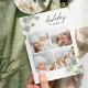 Compartilhe cartões de natal com estes cartões chic de colagem de fotos de Natal com quatro de suas fotos quadradas favoritas emolduradas no topo e no fundo pelas folhas pintadas de eucalipto aquoso em verde pastel. "Desejos Feriados" aparece no topo à direita numa mistura elegante de caligrafia e letras modernas, e o ano está bem preso a uma das folhas. Personalize com seu nome de família no canto inferior esquerdo.