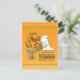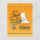 Fantasma giro e engraçado pega carona com abóboras felizes. Cartão postal com a minha ilustração.