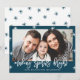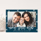 Comemore a temporada de festas com cartões com fotos de festas personalizados. O design de Natal moderno apresenta um esquema de marinho e cor branca, gráficos estelares festivos, sobreposição de fontes de script de tendências e espaços reservados para uma foto e um texto. O cartão com fotos é perfeito para celebrar o Natal, Hanukah ou Anos novos.