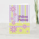 Cartão de Páscoa Espanhol, bonito e divertido, com fontes ousadas Felices Pascuas sobre fundo roxo e verde decorado com flores, listras e bolinhas.