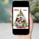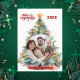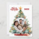 Um fundo branco, texto vermelho e foto na frente. Decorado com uma grande árvore de Natal. Seu texto e nomes no verso. Feliz Natal é escrito com uma fonte de estilo retrô.