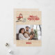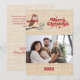 Bússola bege falso como fundo, texto vermelho. Texto e foto na frente. Seu texto e nomes no verso. Feliz Natal é escrito com uma fonte de estilo retrô. Decorado com uma coruja fofa vestindo um cachecol vermelho e um gorro. Imagem burlap, não é tecido real.