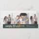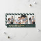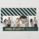Um cartão com fotos festivo com um guião de Natal dourado com três fotos e um fundo verde.