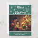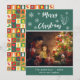 Um Cartões de foto de Natal moderno em verde e branco. Personalize e adicione sua foto de família para os cartões de natal. Feliz Natal em branco com flocos de neve. Modelo para seu nome de família na frente. Cor de fundo verde. Traseiro: Padrão tradicional com símbolos de Natal