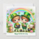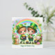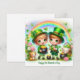 Cartão de Boas Festas do Dia de São Patrício com um Menino e uma Menina Fofos, Potes de Ouro, Trevos, Flores, Animais e um Arco-íris