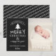 Tipografia festiva e árvore de Natal, fotografia de solteiro, cartão de férias preto de aquarela.