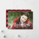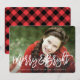 Mande alegria de férias com um cartão com fotos personalizado! Este design de cartão com fotos sazonal apresenta uma imagem de perda de cheio com uma sobreposição de fontes com letra esfregada e um padrão acolhedor de xadrez de búfalo no verso.