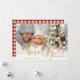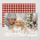 Cartão com fotos Dourado de Natal Feliz com o Padrão de Xadrez Vermelho e Branco no verso.