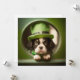 Celebrar Ruas. Dia de Patrick com um cachorrinho bonito em um chapéu verde. Esta é uma placa plana. Os fundos dizem: Ruas felizes. Dia de Patrick.