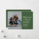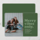 A feliz vibe apenas nesta temporada de festas! Envie um cartão de feriado retrô divertido com este design verde de uma foto. O tipo verde de retorno diz "apenas vibrações de feliz" e também tem espaço para uma mensagem, nome e ano personalizados. A parte de trás da coordenação é verde com uma textura angustiada para completar o olhar da safra.