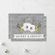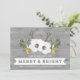 Cartão personalizável de natal brilhante e feliz para filho e filha em lei em padrão de madeira de cinza rústica com flores festivas brancas, prateadas e douradas e galhadas de veados.