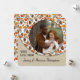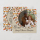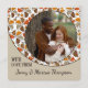 Cartão único, clássico, de moda, bonito e decorativo de Ação de Graças. Recortar com amor do texto e da sala para personalizar ou personalizar com uma foto e nomes (ou nome da família) de sua escolha. Com o clássico cor de laranja quente de outono, folhas botânicas vermelhas e marrons como design de fundo. E um poema personalizável e pensável da temporada de outono que cumprimenta o lado de trás do cartão.