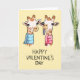Cartão saudoso, manuscrito, com a imagem de duas girafas do pescoço, com pelo branco e marcas de salto castanho, vestindo os cachecóis (cachecol azul na girafa esquerda e cachecol rosa na girafa direita) e uma girafa enfiando a língua. "Feliz dia de os namorados" manuscrito em letras maiúsculas abaixo.